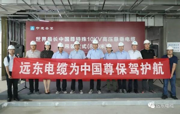 從2018年3月首批產(chǎn)品敷設,到8月份長達820米的世界最長特殊10KV高壓垂懸電纜成功敷設,歷經(jīng)6個月的吊裝作業(yè),遠東電纜一共為中國尊項目敷設了24根懸垂電纜,總長達15132米,總重達136.38噸,創(chuàng)造了多個世界首次、世界之最。這一成績的取得離不開遠東團隊的努力和付出,從電纜進場開始就進行全程跟蹤,以創(chuàng)新技術(shù)破解了超高層供電系統(tǒng)技術(shù)難題,保障了吊裝電纜敷設工作安全、有序進行,實現(xiàn)了超高層垂直高壓電纜敷設技術(shù)的新突破。